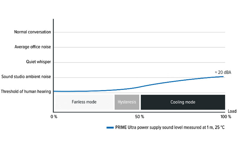 Cette alimentation Seasonic PRIME est dotée du système Premium Hybrid Fan Control qui permet de réduire au maximum le bruit généré par le ventilateur. Ainsi, en dessous de 40% de charge, le bloc est en mode 0 dB (fanless) puis le ventilateur se met en route proportionnellement à la sollicitation de la configuration.