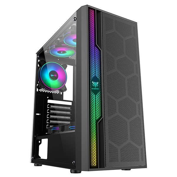 Ainsi, le boîtier HYBROK VOLCANO ARGB pourra intégrer une carte-mère Micro ATX, ATX ou Mini-ITX, une carte graphique de 384 mm de longueur maximale, une alimentation de 210 mm ainsi qu’un ventilateur CPU de 176 mm de hauteur maximale. Installez 4 disques 2.5″ ainsi que 3 disques 3.5″ via la cage HDD disponible.