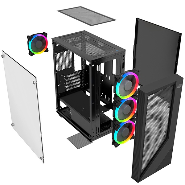 Le boitier moyen tour SG ONE 4 FAN FRGB NOIR se distingue en proposant une paroi latérale et une façade en verre trempé pour admirer le rétroéclairage RGB fixe de votre setup gaming. Il vous permettra de vous concevoir une configuration basée sur une carte mère de type ATX, Micro-ATX ou Mini-ITX.