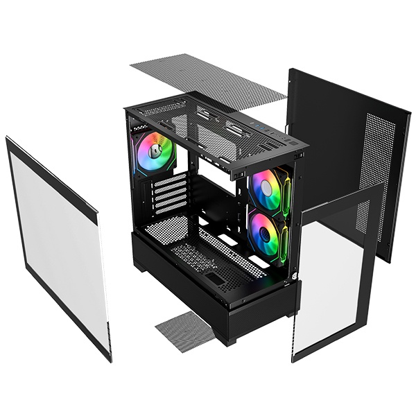 Le SG PRO MINI est un boîtier Micro-ATX qui met l’accent sur les composants montés à l’intérieur grâce à sa façade et sa paroi latérale en verre trempé. Le flux d’air et la compatibilité avec les radiateurs ne sont pas négligés, puisqu’il permet de monter des watercooling jusqu’à 360mm que ce soit en haut.