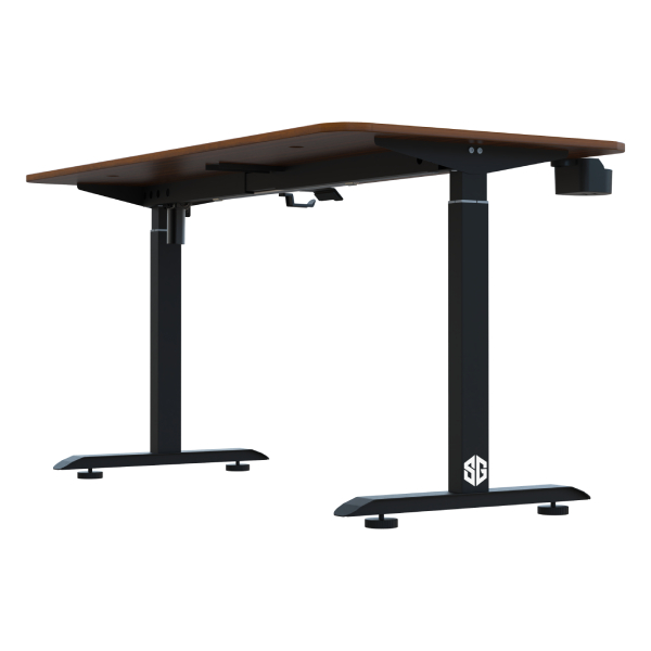 Bureau réglable SG SGD-M140 WALNUT – design noyer élégant, moteur simple, hauteur ajustable de 73 à 117 cm, fonctions intelligentes, support casque et porte-gobelet intégrés.