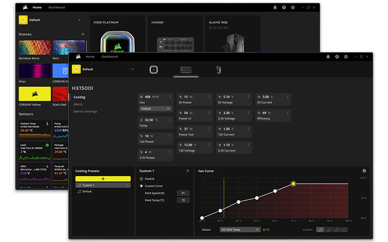 Avec le logiciel CORSAIR iCUE, vous pouvez surveiller la performance de l’alimentation, basculer entre les modes multirail et monorail et contrôler la vitesse du ventilateur directement depuis votre bureau.
