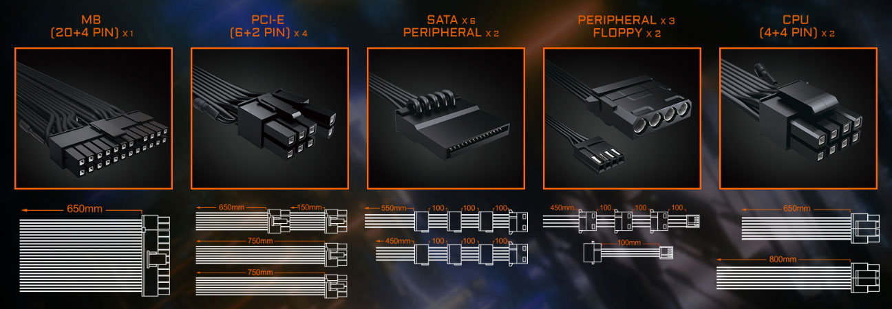 Cette alimentation Aorus est de conception 100% modulaire, si bien que vous n’avez qu’à installer que les câbles nécessaires en fonction de vos usages. Cela vous permettra de réduire l’encombrement et optimiser la circulation du flux d’air pour une meilleure dissipation de la chaleur.