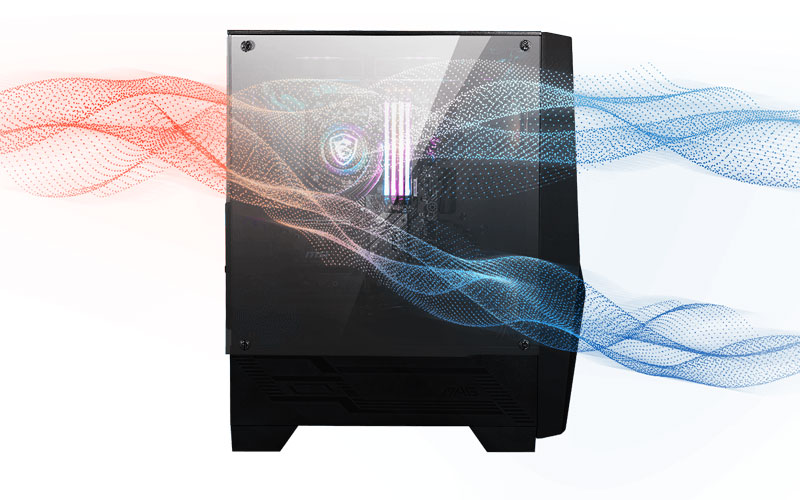 Au-delà de ses bonnes performances, ce boîtier propose un look moderne et agressif, renforcé par le système d’éclairage ARGB sur les ventilateurs en façade. En effet, ce système est capable de créer de splendides effets lumineux, que vous pouvez même synchroniser avec vos autres produits compatibles MSI Mystic Light afin d’aboutir à un résultat homogène. Le panneau latéral en verre trempé de 4 mm allie de son côté style et robustesse pour mettre en avant le rétroéclairage que vous aurez choisi.